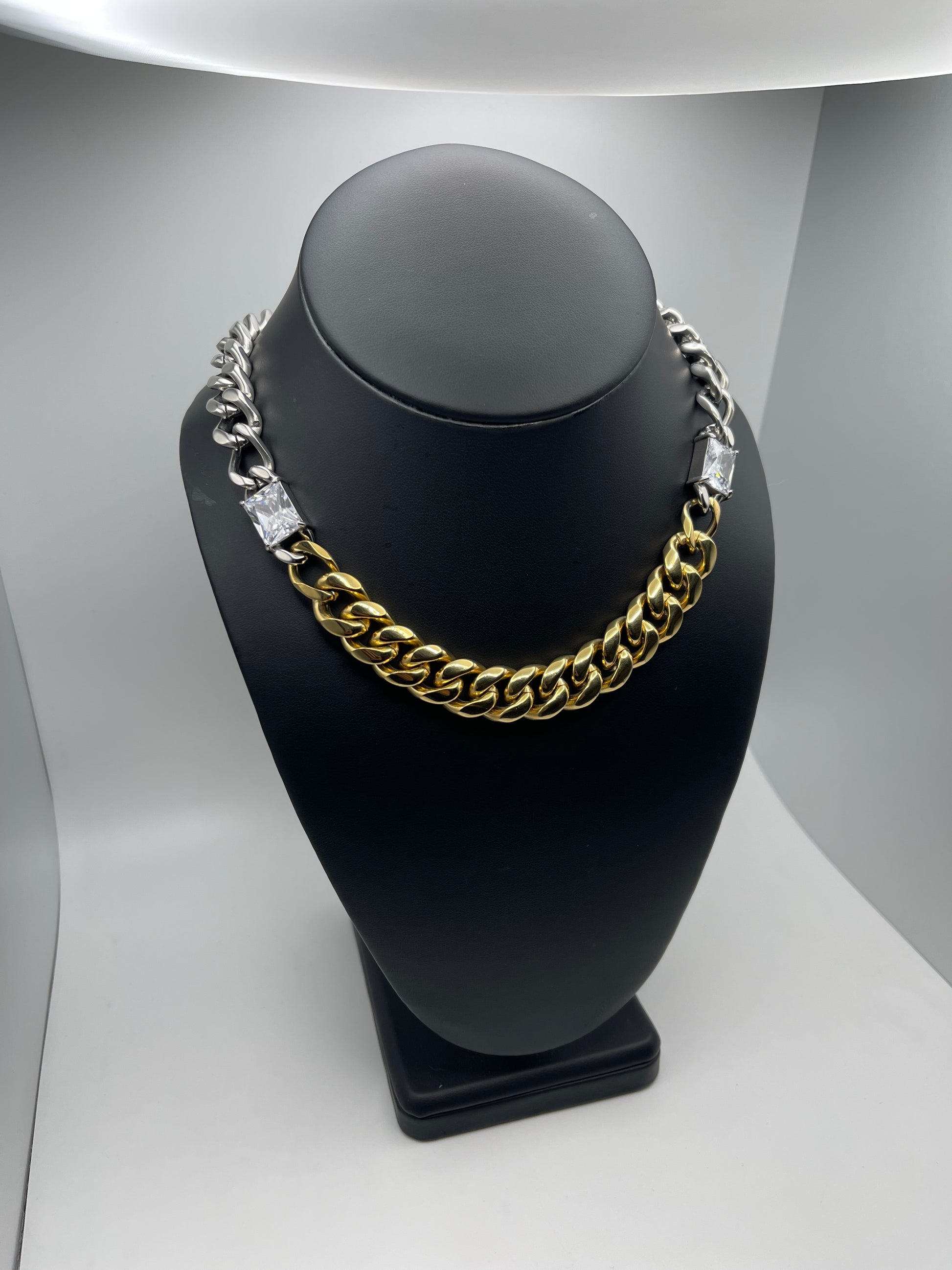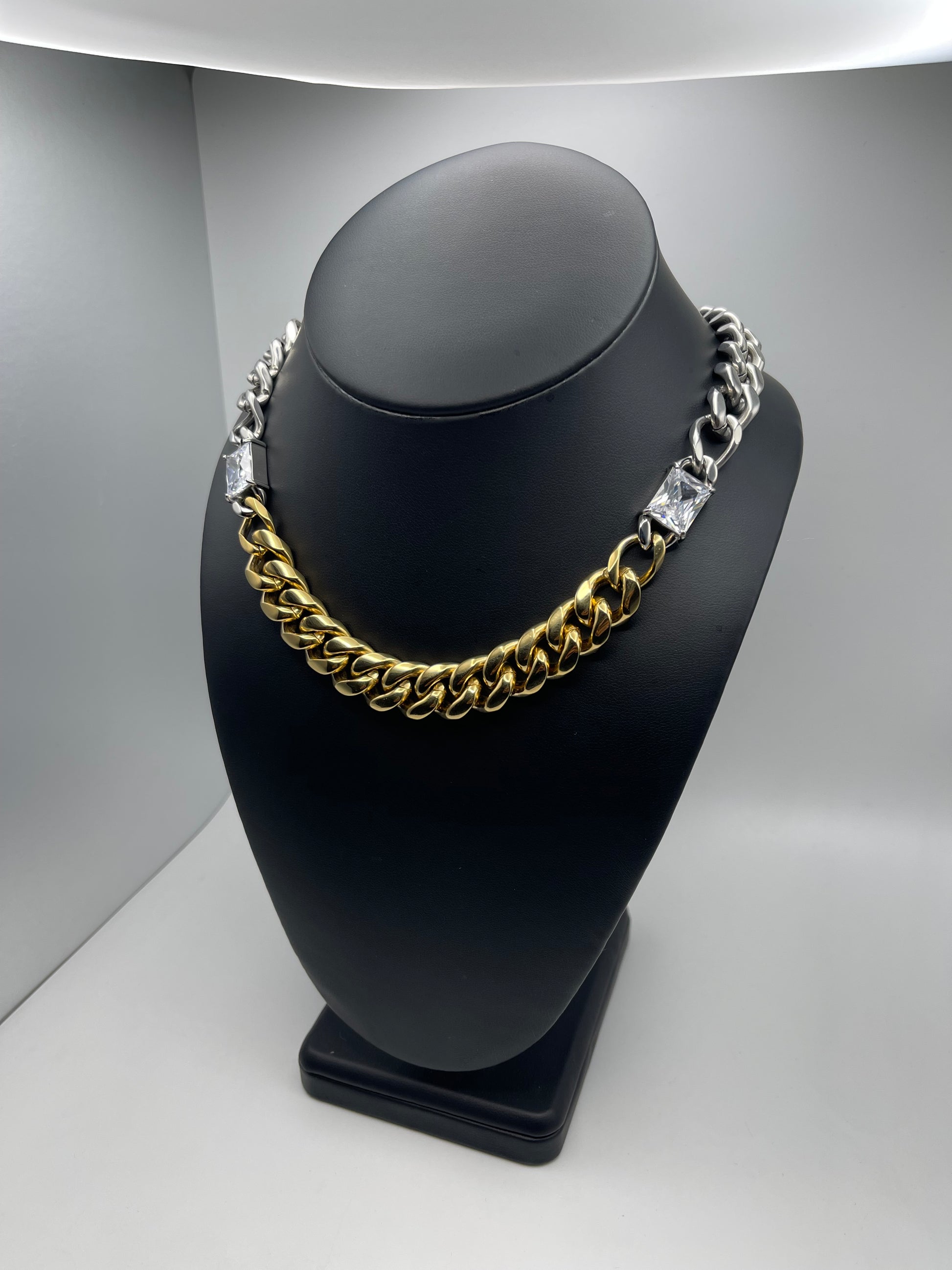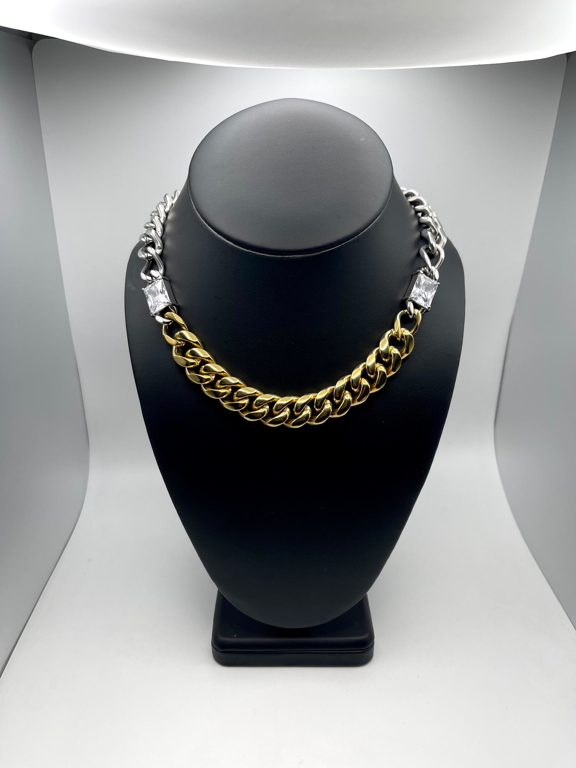 - PVD Gold Cuban Link (front), SS Flat Cuban Link (back)